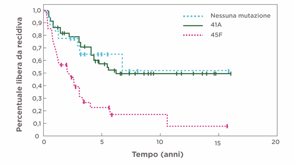 - La sopravvivenza libera da recidiva a 5 anni era significativamente più scarsa nei pazienti con tumori desmoidi S45F-mutati (P<0,0001) rispetto ai pazienti con mutazione T41A o con tumori non mutati29